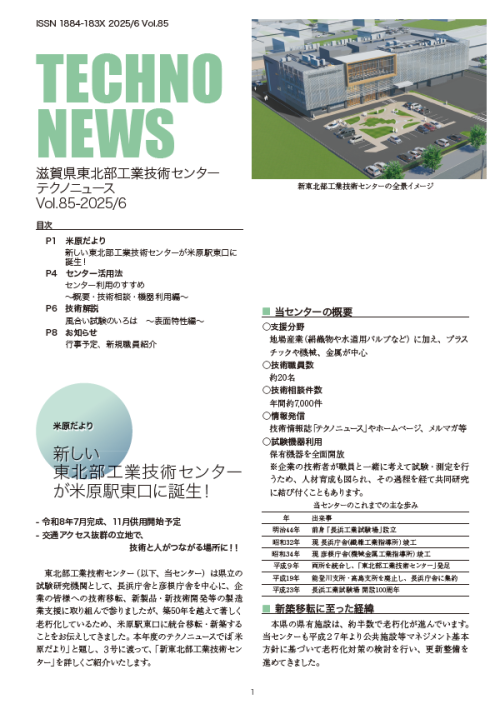 テクノニュースVol.85を発行しました 米原だより(新しい東北部工業技術センターが米原駅東口に誕生!)、センター活用法(センター利用のすすめ~概要・技術相談・機器利用編~)、技術解説(風合い試験のいろは ~表面特性編~)、お知らせ(行事予定、新規職員紹介) 発行年度 Vol. 内 容 R7 Vol.85 R7/6 米原だより(新しい東北部工業技術センターが米原駅東口に誕生!) センター活用法(センター利用のすすめ~概要・技術相談・機器利用編~) 技術解説(風合い試験のいろは ~表面特性編~) お知らせ(行事予定、新規職員紹介) バックナンバーはこちら
