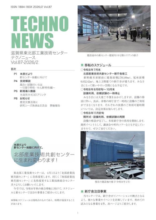 テクノニュースVol.87を発行しました 米原だより(新センター始動に向けて)、技術解説(風合い試験のいろは ~引張り特性・せん断特性編~) 新規導入機器(光造形方式3Dプリンタ)、お知らせ(意見交換活発に 研究シーズ発表&交流会 開催報告) 発行年度 Vol. 内 容 R7 Vol.87 R8/2 米原だより(新センター始動に向けて) 技術解説(風合い試験のいろは ~引張り特性・せん断特性編~) 新規導入機器(光造形方式3Dプリンタ) お知らせ(意見交換活発に 研究シーズ発表&開催報告) バックナンバーはこちら